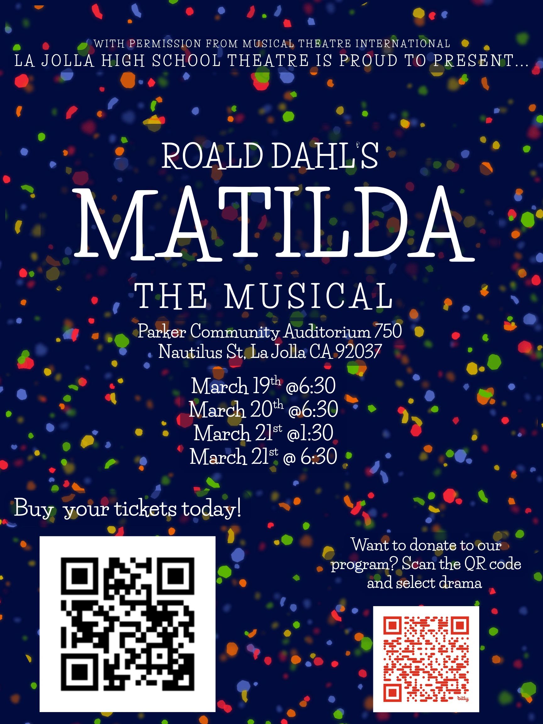 Only 1% of La Jolla High School's budget goes to the Theater Department. Without your donations, we would not have a theater program. 100% of your donation, ticket purchases goes back into our performances, costumes, sets, and improvements to the theatre itself.